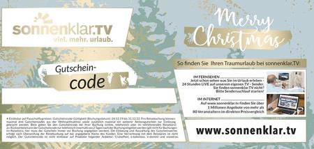 Einlösbar auf Pauschalflugreisen und Kreuzfahrten. Gutscheincode-Gültigkeit (Buchungsdatum): 18.12.2025 bis 31.12.2028. Pro Reisebuchung können maximal drei Gutscheincodes aus der Weihnachtsaktion sowie zusätzlich maximal ein weiterer Aktionsgutschein zur Einlösung gebracht werden. Bitte geben Sie den Gutscheincode bei Ihrer Buchung (online, telefonisch oder im teilnehmenden Reisebüro) an. Nicht einlösbar nach abgeschlossener Reisebuchung. Die Einlösung und Auszahlung des Gutscheinwertes erfolgt nach Überprüfung der Reisebuchung auf das angegebene Konto des Kunden. Eine Verrechnung mit dem Reisepreis ist nicht möglich. Der Gutscheincode ist nicht einlösbar auf Produkte folgender Anbieter: Travianet, Cruisehost, HomeToGo, Flyondo, Traveltrex, Leitner Reisen, Journaway, CruiseCompass.
